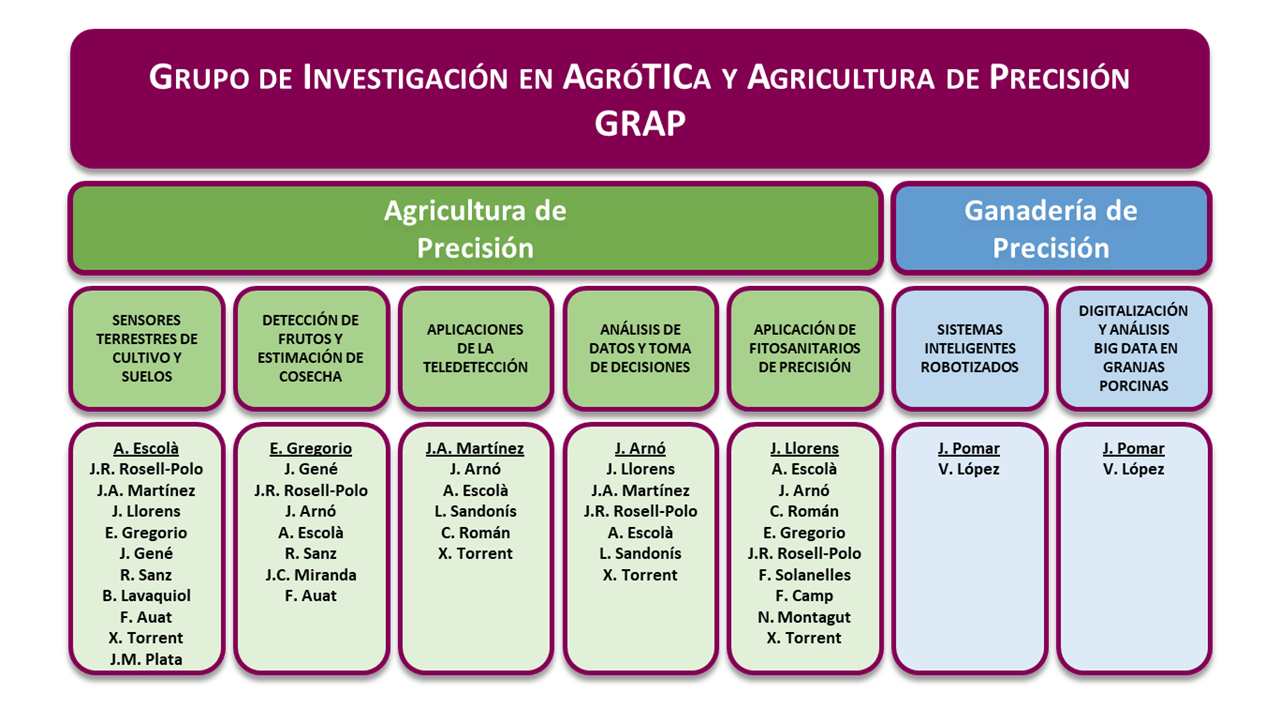 El grupo de investigación está formado por investigadores provenientes de diversos ámbitos, de tal manera que los conocimientos y los campos de aplicación que abarca son complementarios. Los investigadores de la Universitat de Lleida pertenecen todos ellos al Departamento de Ingeniería Agroforestal y al Departamento de Química, Física y Ciencias Ambientales y del Suelo y aportan al grupo conocimientos relacionados con la aplicación de las TIC en el diseño, desarrollo y aplicación de nuevos sensores en el ámbito agrícola, control automático, adquisición de datos , procesamiento de datos y señales, topografía y geoestadística, electrotecnia, desarrollo de dispositivos para embarcar en maquinaria agrícola, ayuda a la toma de decisiones, etc. Los investigadores del Centro de Mecanización Agraria aportan conocimientos aplicados en los diferentes cultivos arbóreos y arbustivos más importantes en superficie y producción de Cataluña: frutales, especialmente en el campo de los sistemas y maquinaria de pulverización, así como conexiones con el sector agroindustrial de equipamiento y maquinaria. Esta composición facilita la interdisciplinariedad necesaria para abordar la investigación y el desarrollo en el reciente campo de la agricultura y ganadería de precisión y la AgróTICa (aplicación de las tecnologías de la información y comunicación al ámbito agrario).